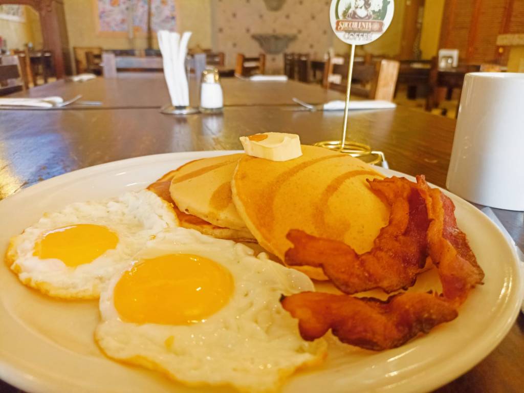 2 piezas, acompañados con huevo, tocino y mantequilla.