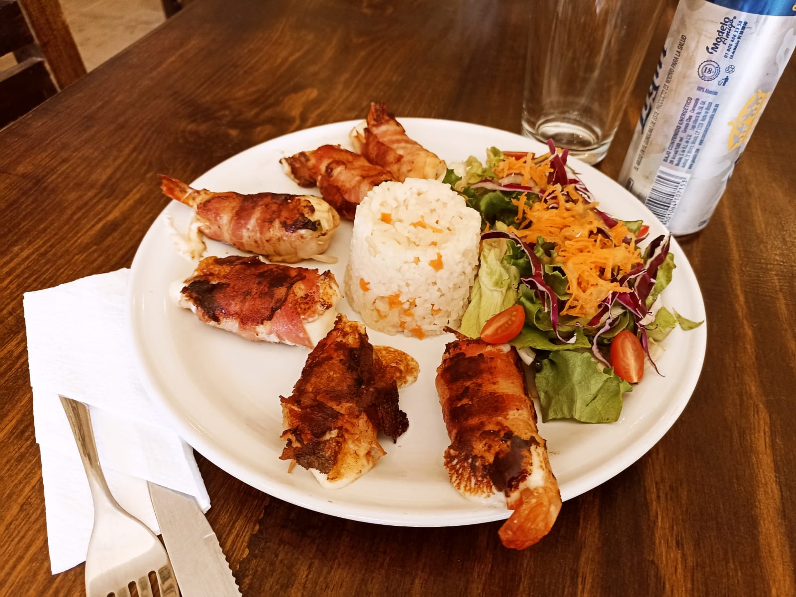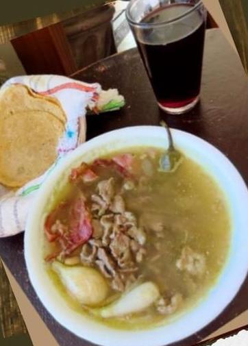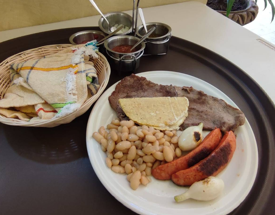 Bistec de res con tocino, frijoles de la olla, cebollita cambray y chile Serrano.