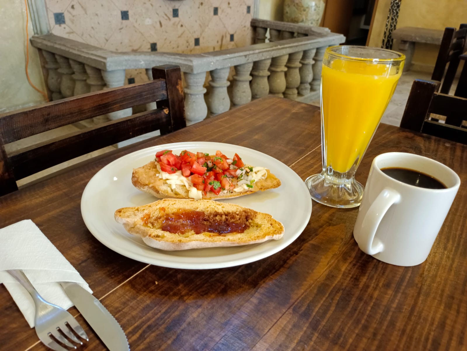 Bolillo untado con frijoles, queso gratinado, chorizo y pico de gallo.